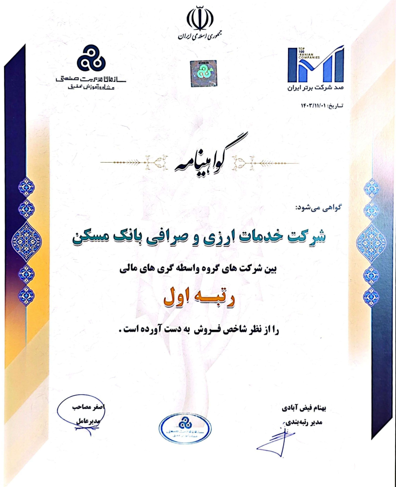 شرکت خدمات ارزی و صرافی بانک مسکن با فعالیت مستمر در صنعت مالی و با همکاری و تلاش پرسنل حرفهای، موفق شد در این رتبهبندی جایگاه اول را از نظر شاخص فروش در گروه واسطه گری مالی، بین 500 شرکت برتر ایرانی کسب نماید.